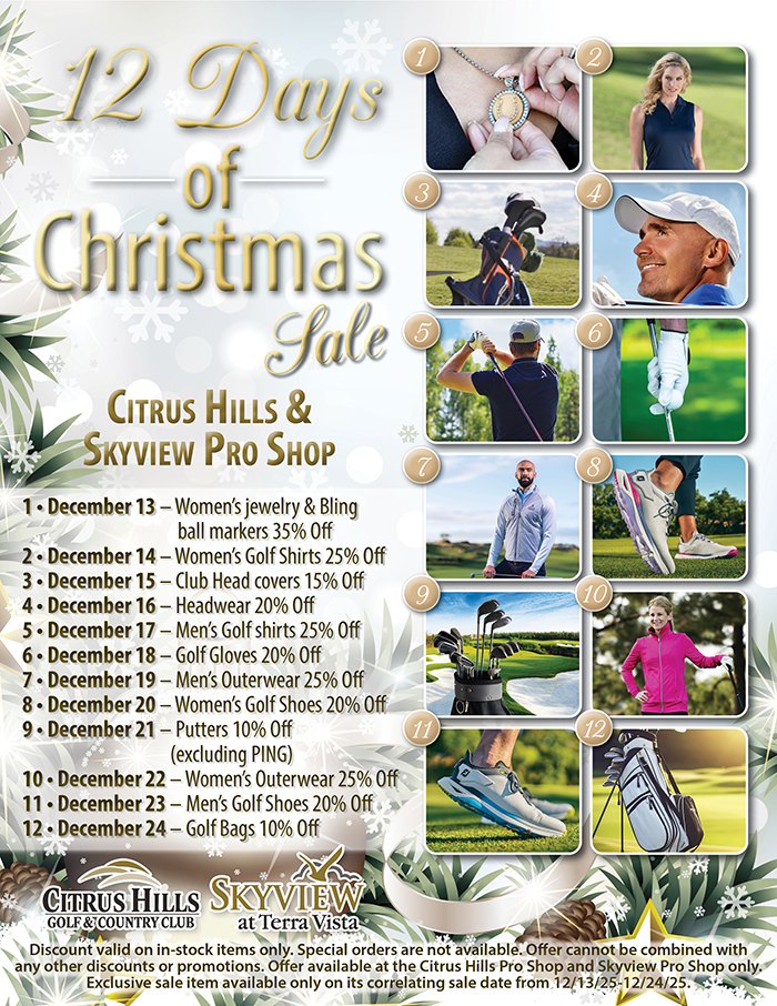 Home Events - Citrus Hills 12 Days of Christmas Sale 12 Days of Christmas Sale + Add to Google Calendar + iCal / Outlook export Date December 15 Time 8:00 am - 6:00 pm Location Skyview Pro Shop Other Locations Citrus Hills Pro Shop 509 E. Hartford, Citrus Hills, FL 34442 Category Golf Share this event