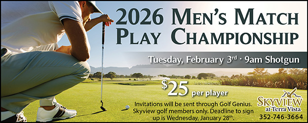 Home Events - Citrus Hills 2026 Men’s Match Play Championship 2026 Men’s Match Play Championship + Add to Google Calendar + iCal / Outlook export Date February 3 Time 9:00 am - 11:00 pm Location Skyview at Terra Vista 2100 N. Terra Vista Boulevard, Citrus Hills, FL Category Golf Share this event