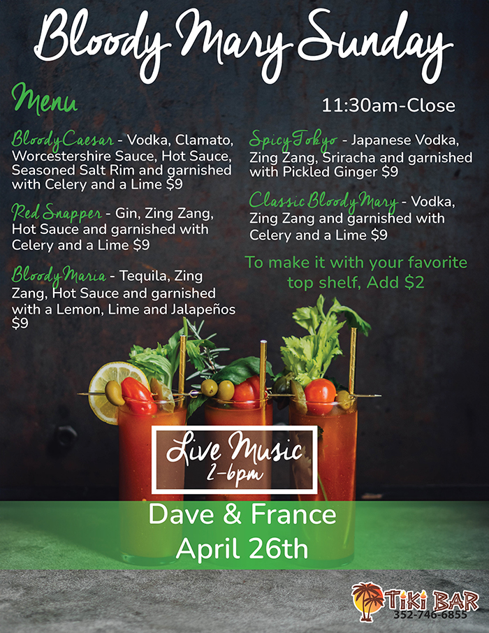 Home Events - Citrus Hills Bloody Mary Sunday at the Tiki Bar with Dave & France Bloody Mary Sunday at the Tiki Bar with Dave & France + Add to Google Calendar + iCal / Outlook export Date April 26 Time 11:30 am - 8:00 pm Location The Tiki Bar 505 E Hartford St, Hernando, FL 34442 Category Tiki Bar Share this event