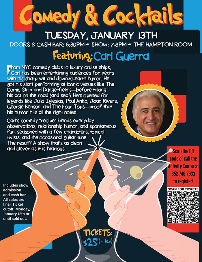 Home Events - Citrus Hills Comedy & Cocktails with Carl Guerra Comedy & Cocktails with Carl Guerra + Add to Google Calendar + iCal / Outlook export Date January 13 Time 6:30 pm - 8:00 pm More Info Purchase Tickets Location Hampton Room Category Club EventsSocial Events Purchase Tickets Share this event