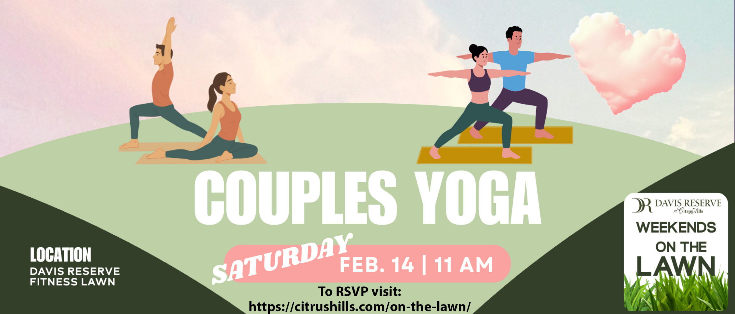 Home Events - Citrus Hills Couples Yoga on the Lawn Couples Yoga on the Lawn + Add to Google Calendar + iCal / Outlook export Date February 14 Time 11:00 am - 12:00 pm More Info Reserve Your Spot! Category Davis Reserve Lawn Reserve Your Spot! Share this event