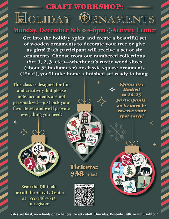 Home Events - Citrus Hills Craft Workshop: Holiday Ornaments Craft Workshop: Holiday Ornaments + Add to Google Calendar + iCal / Outlook export Date December 8 Time 4:00 pm - 6:00 pm More Info Purchase Tickets Location Activity Center Activity Center Category Club EventsSocial Events Purchase Tickets Share this event