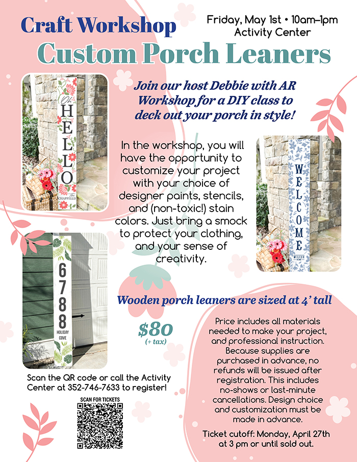 Home Events - Citrus Hills Craft Workshop: Custom Porch Leaners Craft Workshop: Custom Porch Leaners + Add to Google Calendar + iCal / Outlook export Date May 1 Time 10:00 am - 1:00 pm More Info Purchase Tickets Location Activity Center Activity Center Category Social Events Purchase Tickets Share this event