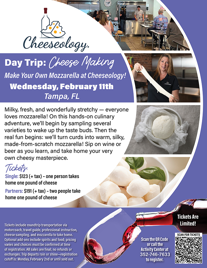 Home Events - Citrus Hills Day Trip: Cheeseology Day Trip: Cheeseology + Add to Google Calendar + iCal / Outlook export Date February 11 Time 10:45 am - 4:30 pm More Info Purchase Tickets Location Activity Center Activity Center Category Social EventsTravel Events Purchase Tickets Share this event