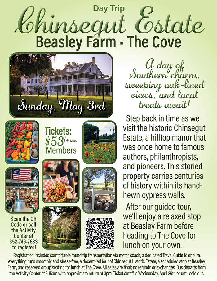 Home Events - Citrus Hills Day Trip: Chinsengut Estate, Beasley Farm, The Cove Day Trip: Chinsengut Estate, Beasley Farm, The Cove + Add to Google Calendar + iCal / Outlook export Date May 3 Time 9:00 am - 3:00 pm More Info Purchase Tickets Location Activity Center Activity Center Category Social EventsTravel Events Purchase Tickets Share this event