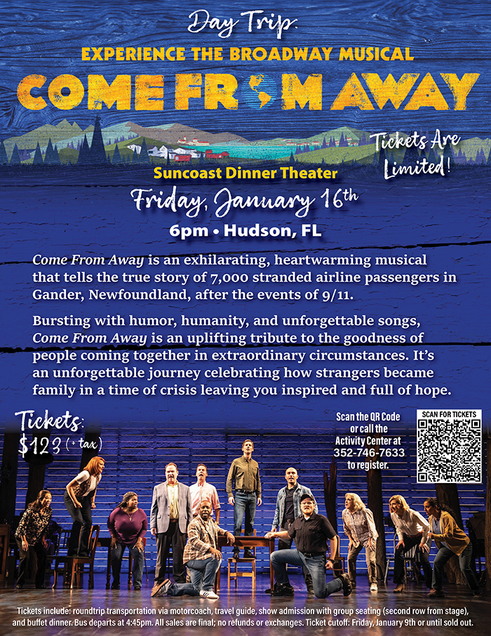 Home Events - Citrus Hills Day Trip: Come From Away Musical Day Trip: Come From Away Musical + Add to Google Calendar + iCal / Outlook export Date January 16 Time 4:45 pm - 9:00 pm More Info Purchase Tickets Location Activity Center Activity Center Category Social EventsTravel Events Purchase Tickets Share this event