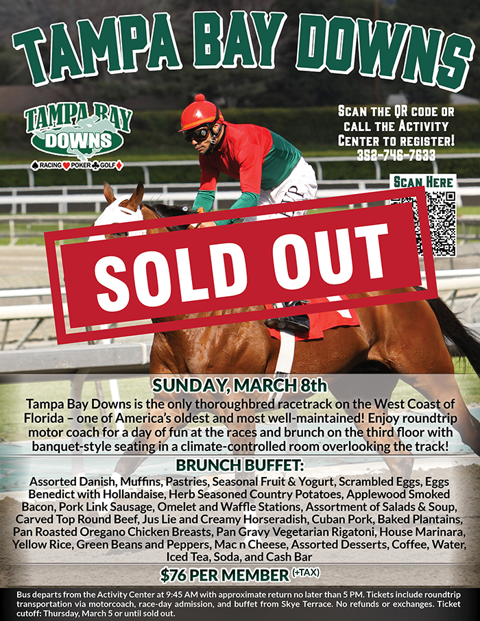 Home Events - Citrus Hills SOLD OUT: Day Trip: Tampa Bay Downs SOLD OUT: Day Trip: Tampa Bay Downs + Add to Google Calendar + iCal / Outlook export Date March 8 Time All Day More Info Purchase Tickets Location Activity Center Activity Center Category Club Events Purchase Tickets Share this event