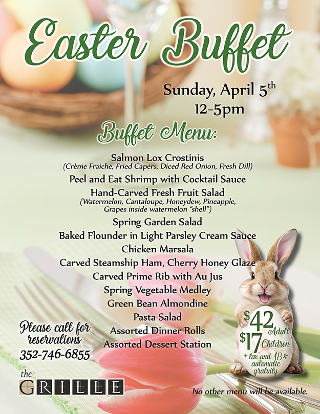 Home Events - Citrus Hills Easter Buffet at The Grille Easter Buffet at The Grille + Add to Google Calendar + iCal / Outlook export Date April 5 Time 12:00 pm - 5:00 pm Location The Grille 505 E Hartford St, Hernando, FL 34442 Category RestaurantsThe Grille Share this event