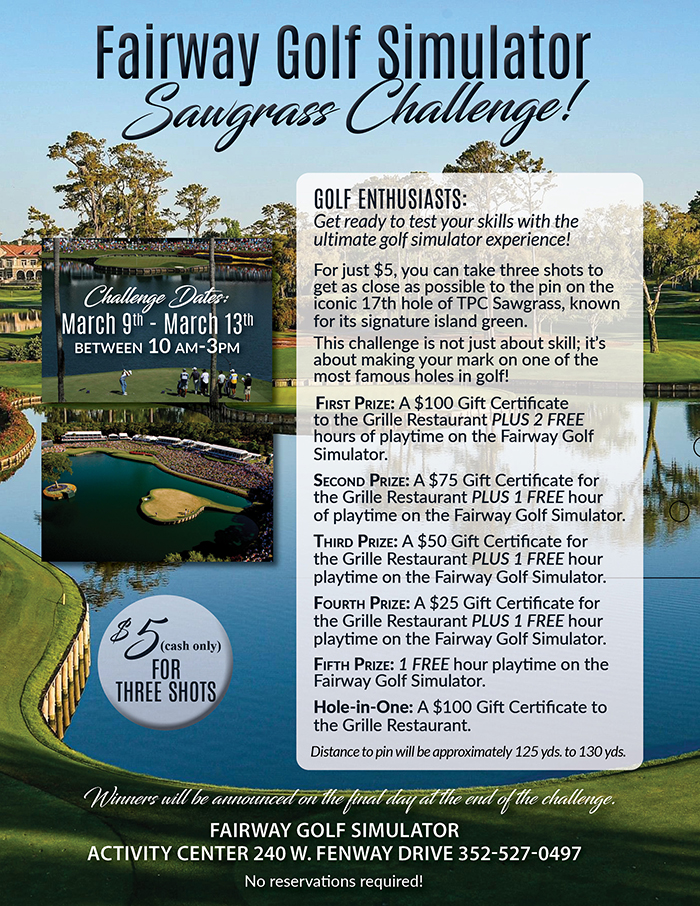 Home Events - Citrus Hills Fairway Golf Simulator – Sawgrass Challenge Fairway Golf Simulator – Sawgrass Challenge + Add to Google Calendar + iCal / Outlook export Date March 9 - 13 Time 10:00 am - 3:00 pm Location Activity Center Activity Center Category Golf Share this event