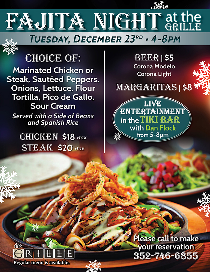 Home Events - Citrus Hills Fajita Night at the Grille Fajita Night at the Grille + Add to Google Calendar + iCal / Outlook export Date December 23 Time 4:00 pm - 8:00 pm Location The Grille 505 E Hartford St, Hernando, FL 34442 Category RestaurantsThe Grille Share this event