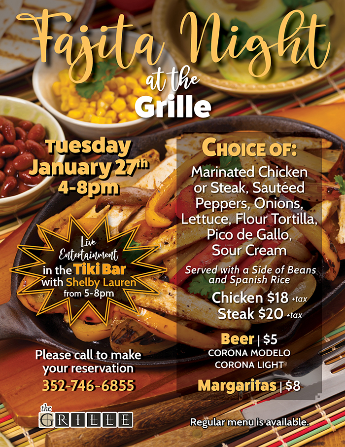 Home Events - Citrus Hills Fajita Night at the Grille Fajita Night at the Grille + Add to Google Calendar + iCal / Outlook export Date January 27 Time 4:00 pm - 8:00 pm Location The Grille 505 E Hartford St, Hernando, FL 34442 Category RestaurantsThe Grille Share this event
