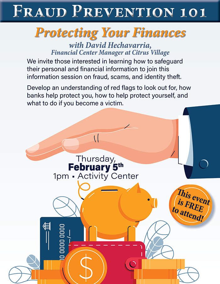 Home Events - Citrus Hills Fraud Prevention 101: Protecting Your Finances Fraud Prevention 101: Protecting Your Finances + Add to Google Calendar + iCal / Outlook export Date February 5 Time 1:00 pm - 3:00 pm Location Activity Center Activity Center Category Club EventsSocial Events Share this event
