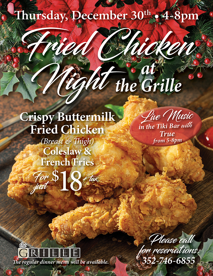 Home Events - Citrus Hills Fried Chicken Night at the Grille Fried Chicken Night at the Grille + Add to Google Calendar + iCal / Outlook export Date December 30 Time 4:00 pm - 8:00 pm Location The Grille 505 E Hartford St, Hernando, FL 34442 Category RestaurantsThe Grille Share this event