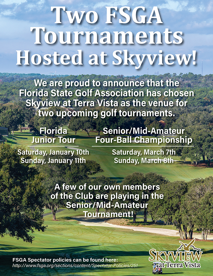 Home Events - Citrus Hills FSGA Golf Tournament: Florida Junior Tour FSGA Golf Tournament: Florida Junior Tour + Add to Google Calendar + iCal / Outlook export Date January 10 Time 8:00 am - 2:00 pm Location Skyview at Terra Vista 2100 N. Terra Vista Boulevard, Citrus Hills, FL Category Golf Share this event