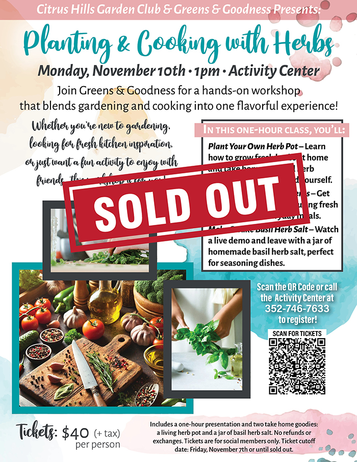 Home Events - Citrus Hills SOLD OUT: Gardening Club: Planting and Cooking with Herbs SOLD OUT: Gardening Club: Planting and Cooking with Herbs + Add to Google Calendar + iCal / Outlook export Date November 10 Expired! Time 1:00 pm - 2:00 pm More Info Purchase Tickets Location Activity Center Activity Center Category Club EventsSocial Events Share this event
