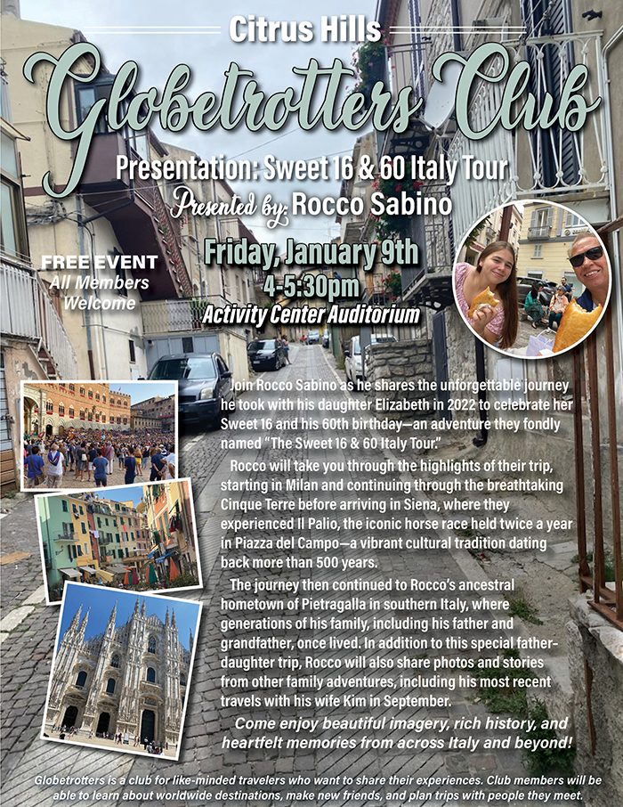 Home Events - Citrus Hills Globtrotters Club Presentation: Tour of Italy Globtrotters Club Presentation: Tour of Italy + Add to Google Calendar + iCal / Outlook export Date January 9 Time 4:00 pm - 5:30 pm Location Activity Center Auditorium Category Club EventsSocial Events Share this event