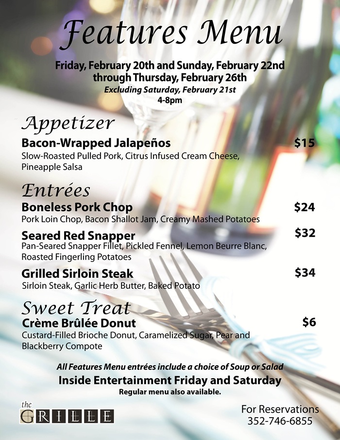 Home Events - Citrus Hills Grille Features Menu Grille Features Menu + Add to Google Calendar + iCal / Outlook export Date February 22 - 26 Time 4:00 pm - 8:00 pm Location The Grille 505 E Hartford St, Hernando, FL 34442 Category The Grille Share this event