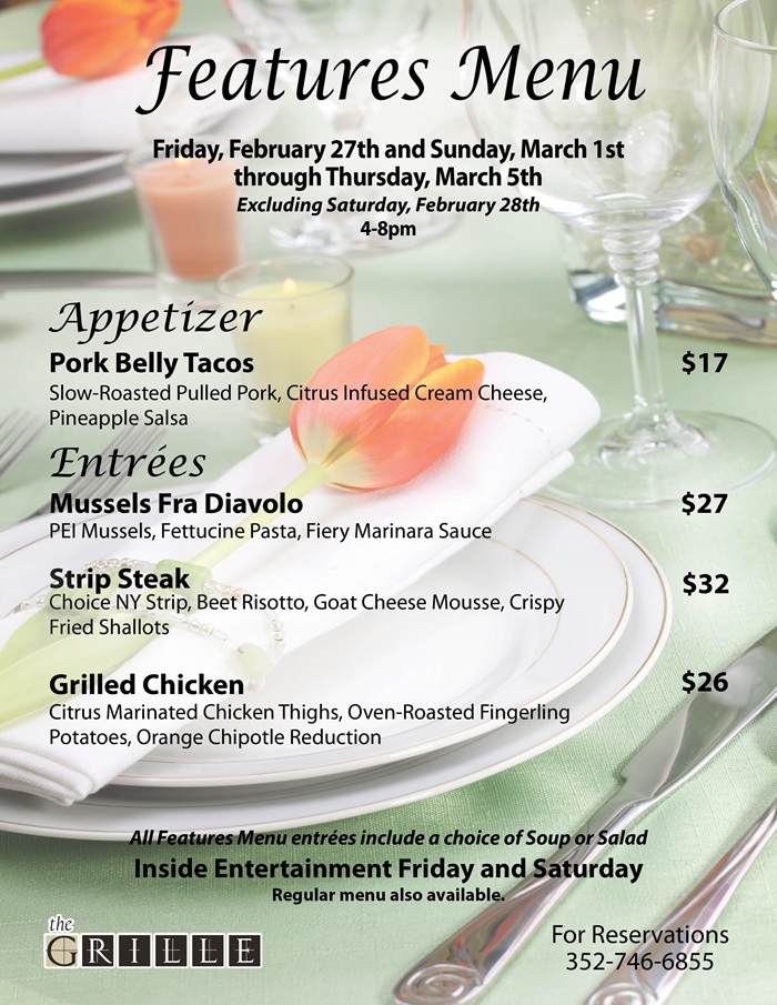 Home Events - Citrus Hills Grille Features Menu Grille Features Menu + Add to Google Calendar + iCal / Outlook export Date February 27 Time 4:00 pm - 8:00 pm Location The Grille 505 E Hartford St, Hernando, FL 34442 Category The Grille Share this event