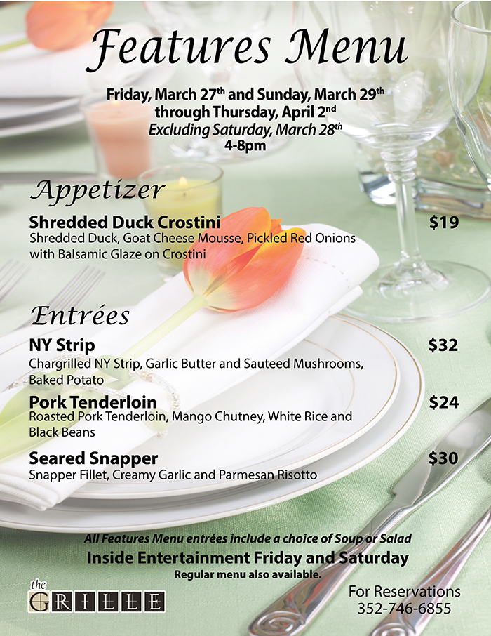 Home Events - Citrus Hills Grille Features Menu Grille Features Menu + Add to Google Calendar + iCal / Outlook export Date March 30 Time 4:00 pm - 8:00 pm Location The Grille 505 E Hartford St, Hernando, FL 34442 Category The Grille Share this event