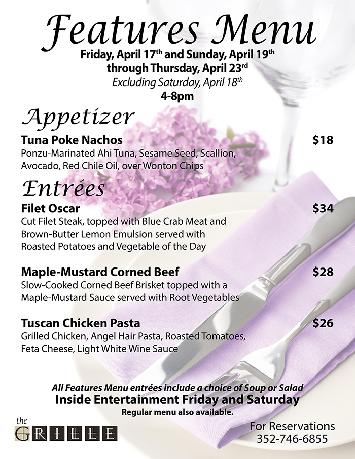 Home Events - Citrus Hills Grille Features Menu Grille Features Menu + Add to Google Calendar + iCal / Outlook export Date April 20 Time 4:00 pm - 8:00 pm Location The Grille 505 E Hartford St, Hernando, FL 34442 Category The Grille Share this event