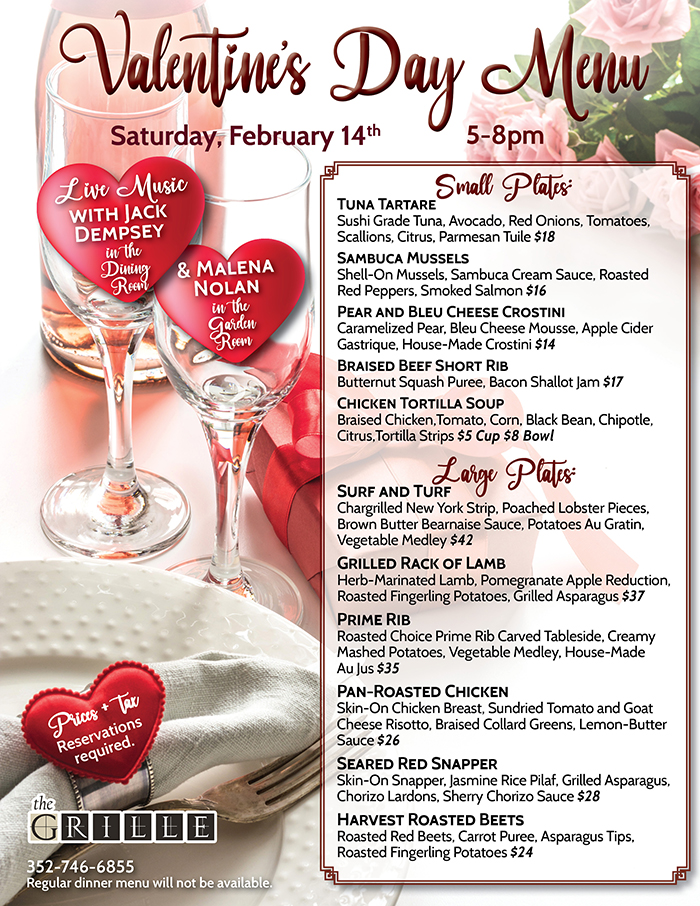 Home Events - Citrus Hills Grille Valentine’s Day Menu Grille Valentine’s Day Menu + Add to Google Calendar + iCal / Outlook export Date February 14 Time 5:00 pm - 8:00 pm Location The Grille 505 E Hartford St, Hernando, FL 34442 Category RestaurantsThe Grille Share this event