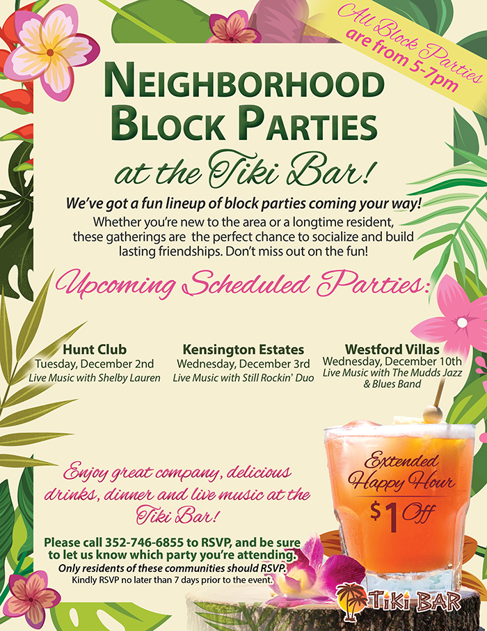 Home Events - Citrus Hills Hunt Club Neighborhood Block Party Hunt Club Neighborhood Block Party + Add to Google Calendar + iCal / Outlook export Date December 2 Time 5:00 pm - 8:00 pm Location The Tiki Bar 505 E Hartford St, Hernando, FL 34442 Category Tiki Bar Share this event