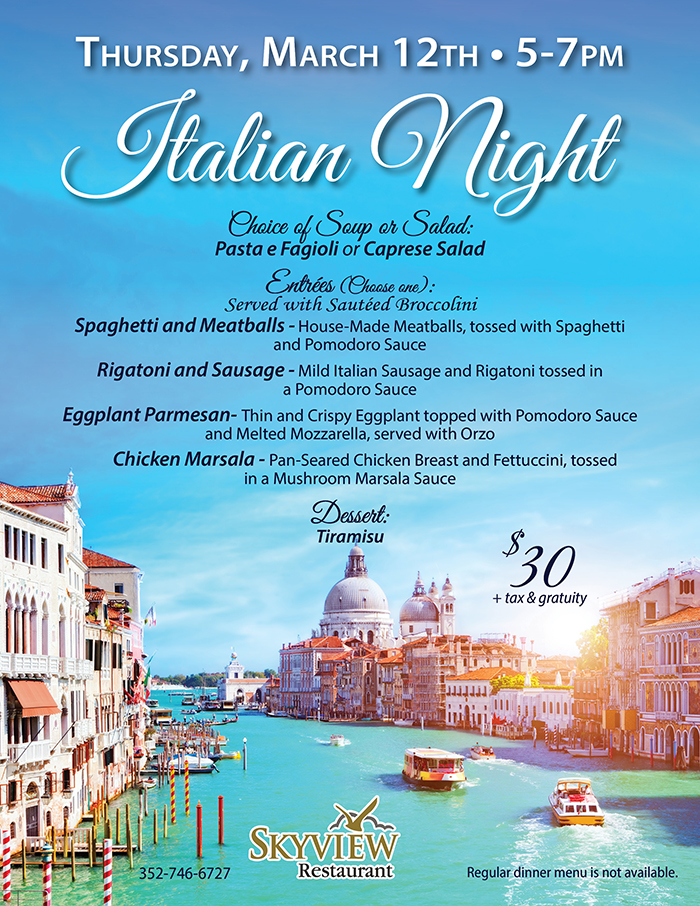 Home Events - Citrus Hills Italian Night at Skyview Italian Night at Skyview + Add to Google Calendar + iCal / Outlook export Date March 12 Expired! Time 5:00 pm - 7:00 pm Location Skyview Restaurant 2100 N Terra Vista Blvd, Hernando, FL 34442 Category RestaurantsSkyview Share this event