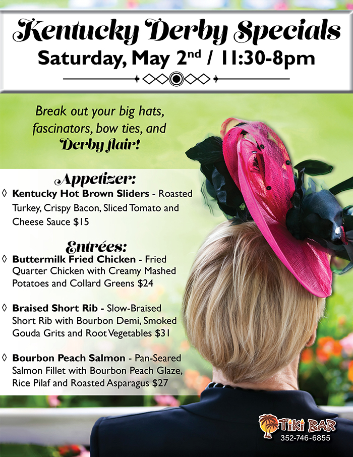 Home Events - Citrus Hills Kentucky Derby at the Tiki Bar Kentucky Derby at the Tiki Bar + Add to Google Calendar + iCal / Outlook export Date May 2 Time 11:30 am - 8:00 pm Location The Tiki Bar 505 E Hartford St, Hernando, FL 34442 Category Tiki Bar Share this event