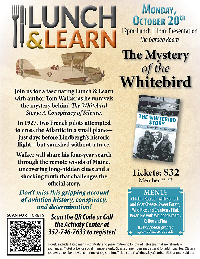 Home Events - Citrus Hills Lunch & Learn: The Mystery of the Whitebird Lunch & Learn: The Mystery of the Whitebird + Add to Google Calendar + iCal / Outlook export Date October 20 Time 12:00 pm - 2:00 pm More Info Purchase Tickets Location Garden Room Category Social Events Purchase Tickets Share this event