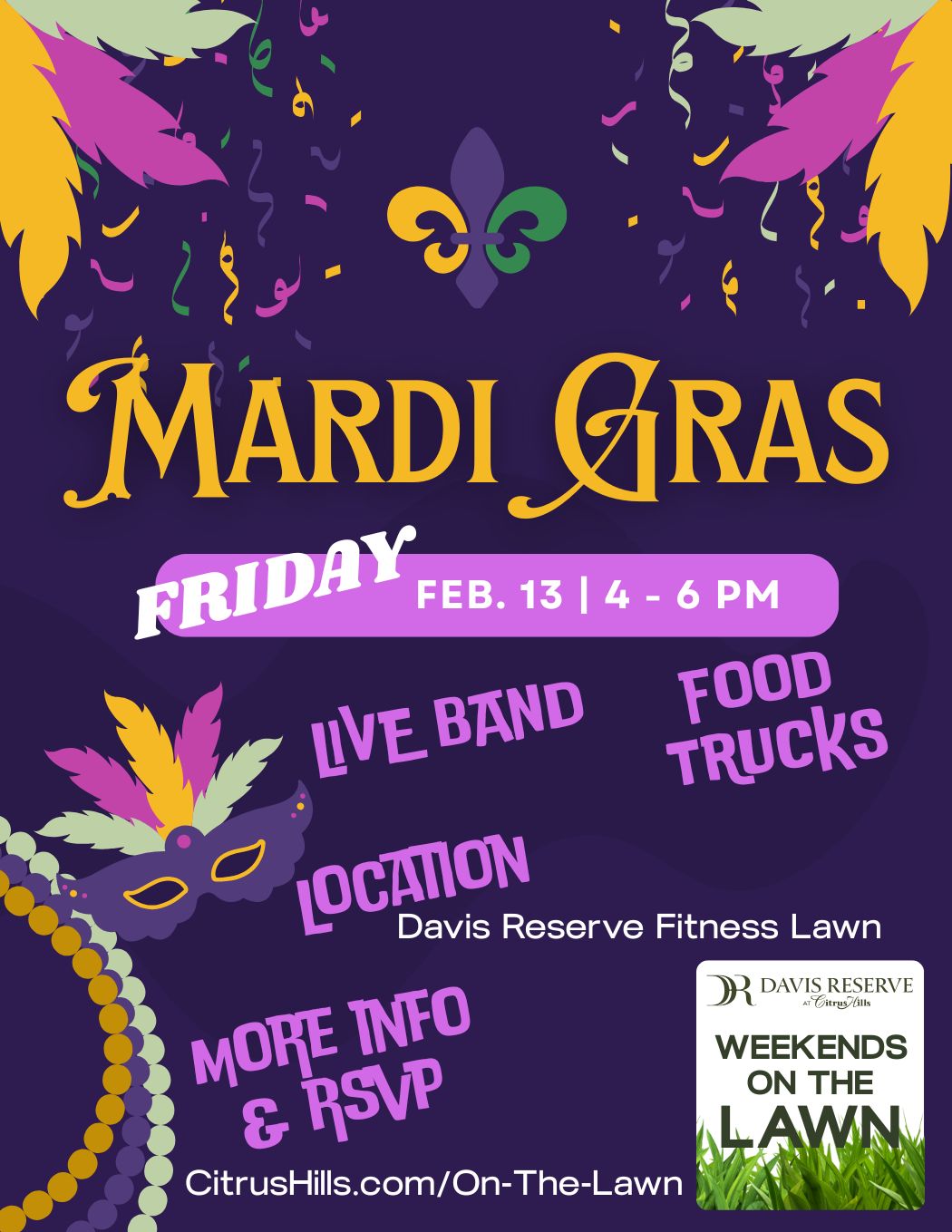 Home Events - Citrus Hills Mardi Gras On the Lawn Mardi Gras On the Lawn + Add to Google Calendar + iCal / Outlook export Date February 13 Expired! Time 4:00 pm - 6:00 pm More Info Reserve Your Spot! Location Davis Reserve Lawn Category Davis Reserve Lawn Share this event