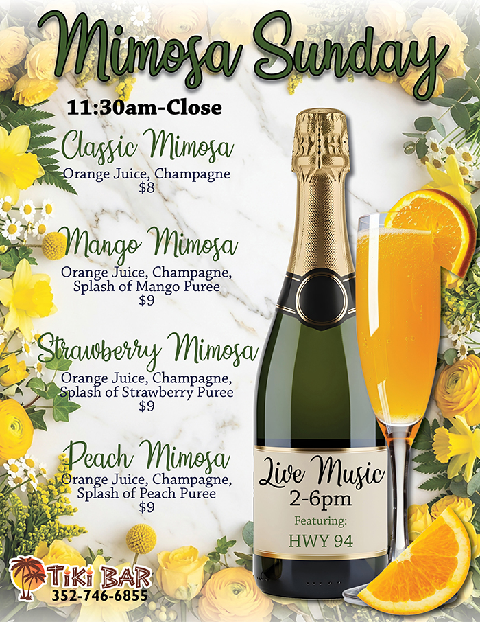 Home Events - Citrus Hills Mimosa Sunday at the Tiki Bar with HWY 94 Mimosa Sunday at the Tiki Bar with HWY 94 + Add to Google Calendar + iCal / Outlook export Date April 19 Time 11:30 am - 8:00 pm Location The Tiki Bar 505 E Hartford St, Hernando, FL 34442 Category Live EntertainmentTiki Bar Share this event