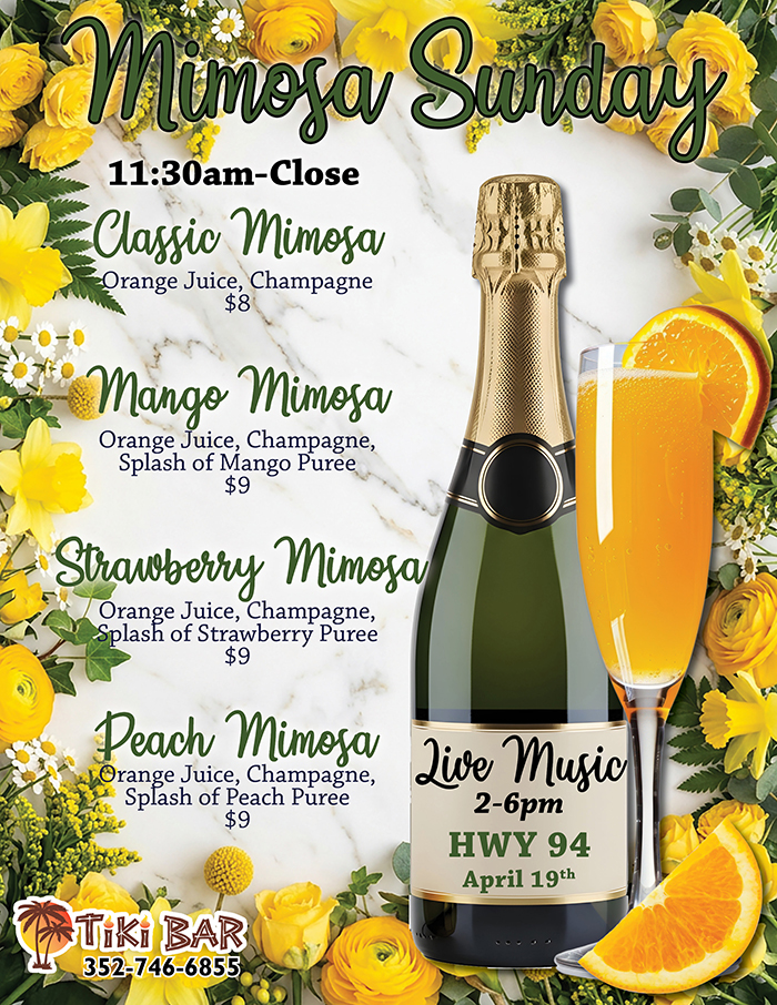 Home Events - Citrus Hills Mimosa Sunday at the Tiki Bar with HWY 94 Mimosa Sunday at the Tiki Bar with HWY 94 + Add to Google Calendar + iCal / Outlook export Date April 19 Time 11:30 am - 8:00 pm Location The Tiki Bar 505 E Hartford St, Hernando, FL 34442 Category Live EntertainmentTiki Bar Share this event