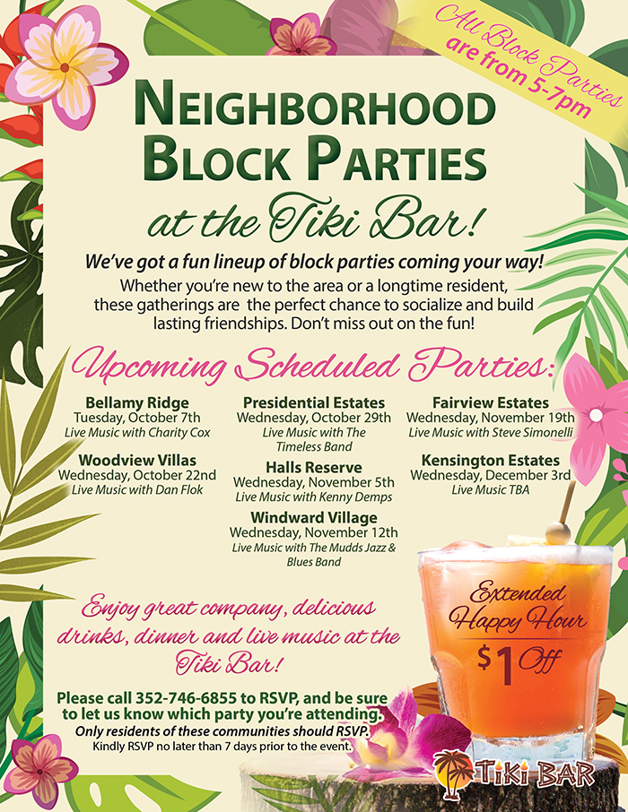 Home Events - Citrus Hills Neighborhood Block Party: Bellamy Ridge Neighborhood Block Party: Bellamy Ridge + Add to Google Calendar + iCal / Outlook export Date October 7 Expired! Time 5:00 pm - 7:00 pm Location The Tiki Bar 505 E Hartford St, Hernando, FL 34442 Category Social EventsTiki Bar Share this event