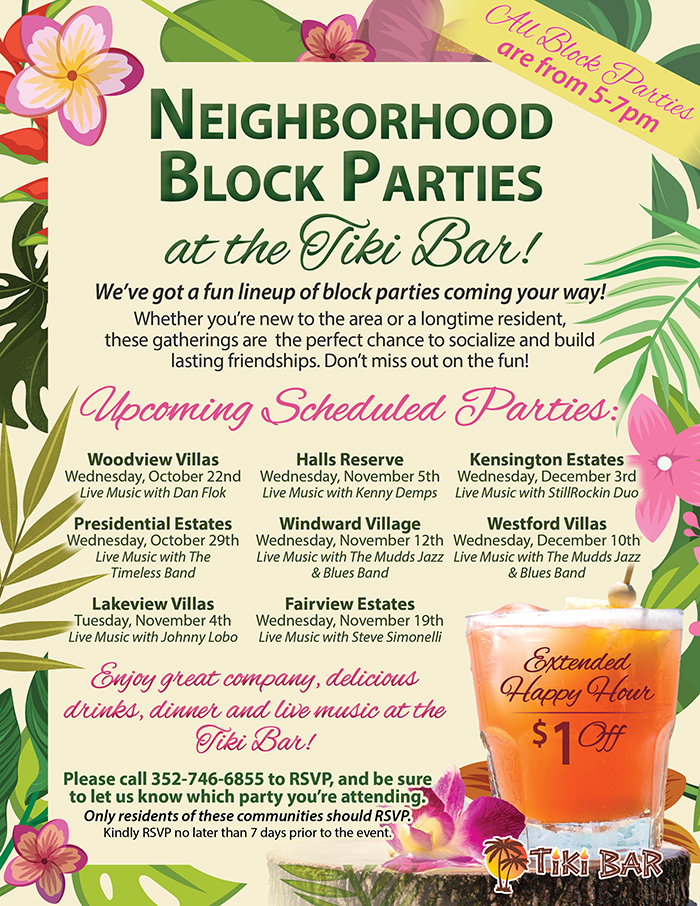 Home Events - Citrus Hills Neighborhood Block Party: Woodview Villas Neighborhood Block Party: Woodview Villas + Add to Google Calendar + iCal / Outlook export Date October 22 Time 5:00 pm - 7:00 pm Location The Tiki Bar 505 E Hartford St, Hernando, FL 34442 Category Social EventsTiki Bar Share this event