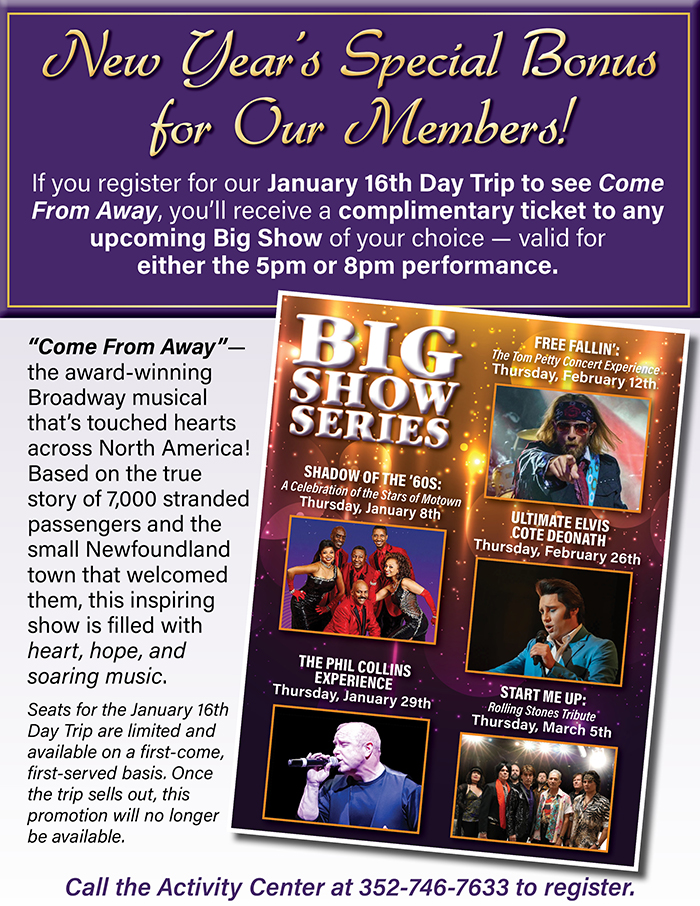 Home Events - Citrus Hills New Year’s Special Bonus for Come From Away Day Trip New Year’s Special Bonus for Come From Away Day Trip + Add to Google Calendar + iCal / Outlook export Date January 16 Time All Day Location Activity Center Activity Center Category Club EventsSocial Events Share this event