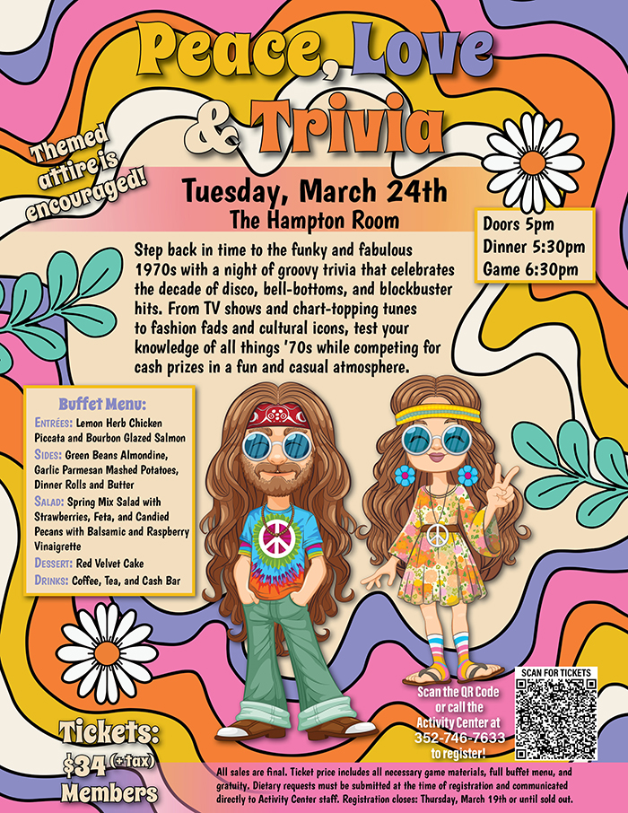Home Events - Citrus Hills Peace, Love, and Trivia Peace, Love, and Trivia + Add to Google Calendar + iCal / Outlook export Date March 24 Time 5:00 am - 8:00 pm More Info Purchase Tickets Location Hampton Room Category Club EventsSocial Events Purchase Tickets Share this event