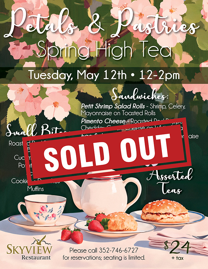 Home Events - Citrus Hills SOLD OUT: Petals & Pastries Spring High Tea at Skyview Restaurant SOLD OUT: Petals & Pastries Spring High Tea at Skyview Restaurant + Add to Google Calendar + iCal / Outlook export Date May 12 Time 12:00 pm - 2:00 pm Location Skyview Restaurant 2100 N Terra Vista Blvd, Hernando, FL 34442 Category Skyview Share this event