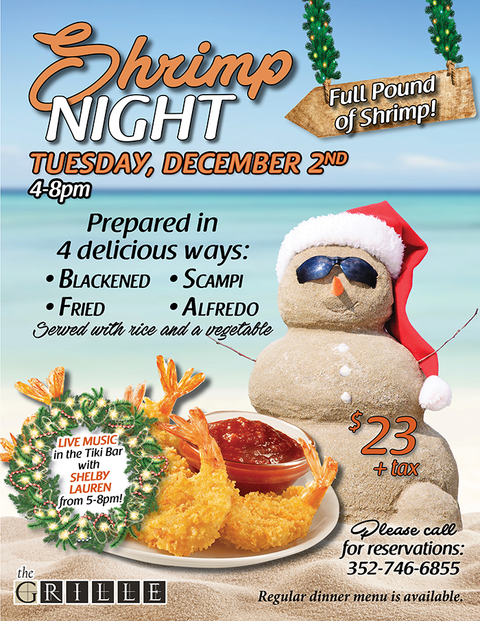 Home Events - Citrus Hills Shrimp Night at the Grille Shrimp Night at the Grille + Add to Google Calendar + iCal / Outlook export Date December 2 Time 4:00 pm - 8:00 pm Location The Grille 505 E Hartford St, Hernando, FL 34442 Category RestaurantsThe Grille Share this event