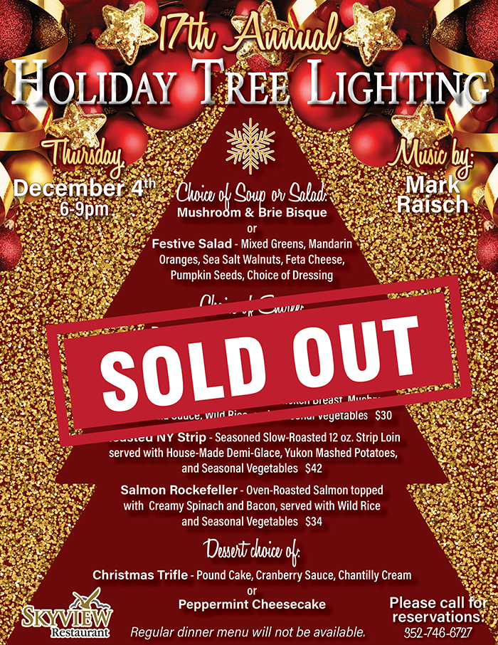 Home Events - Citrus Hills SOLD OUT: Skyview 17th Annual Holiday Tree Lighting SOLD OUT: Skyview 17th Annual Holiday Tree Lighting + Add to Google Calendar + iCal / Outlook export Date December 4 Time 6:00 pm - 9:00 pm Location Skyview Restaurant 2100 N Terra Vista Blvd, Hernando, FL 34442 Category RestaurantsSkyview Share this event