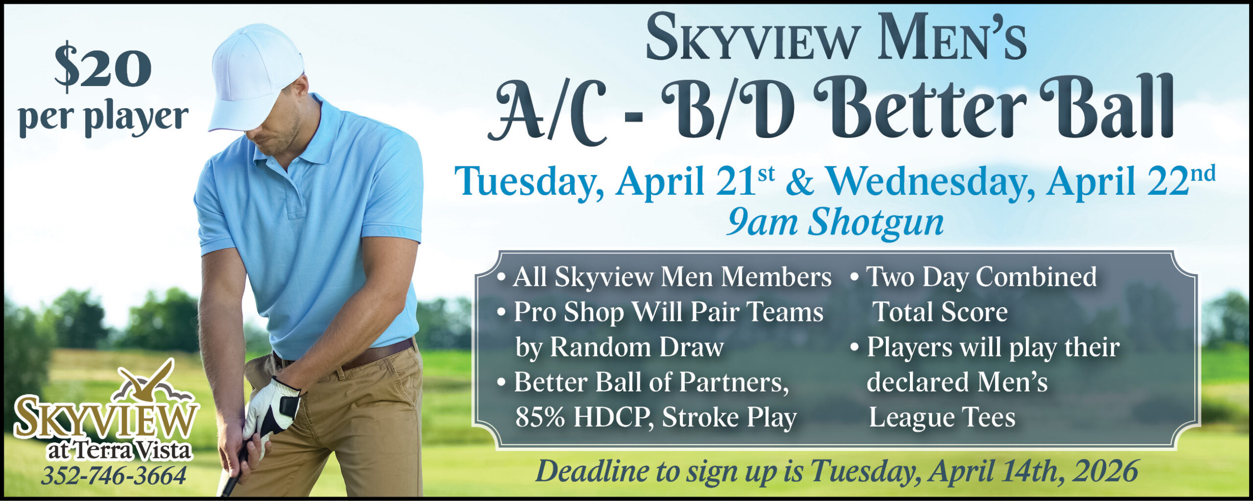 Home Events - Citrus Hills Skyview Better Ball Tournament (A/C B/D) Skyview Better Ball Tournament (A/C B/D) + Add to Google Calendar + iCal / Outlook export Date April 21 Time 9:00 am - 5:00 pm Location Skyview at Terra Vista 2100 N. Terra Vista Boulevard, Citrus Hills, FL Category Golf Share this event