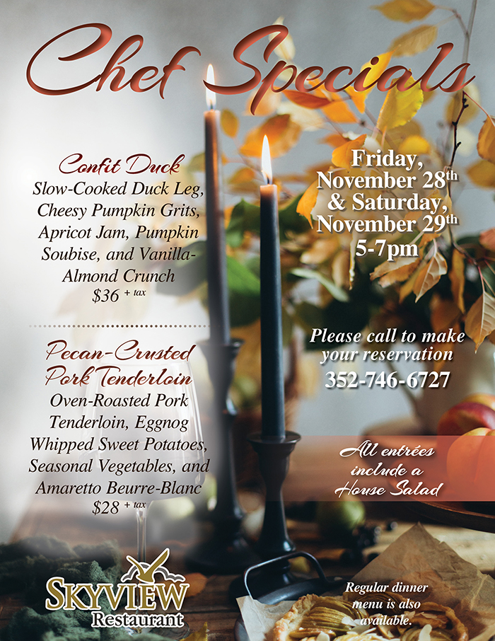 Home Events - Citrus Hills Skyview Chef Specials Skyview Chef Specials + Add to Google Calendar + iCal / Outlook export Date November 29 Time 5:00 pm - 7:00 pm Location Skyview Restaurant 2100 N Terra Vista Blvd, Hernando, FL 34442 Category RestaurantsSkyview Share this event