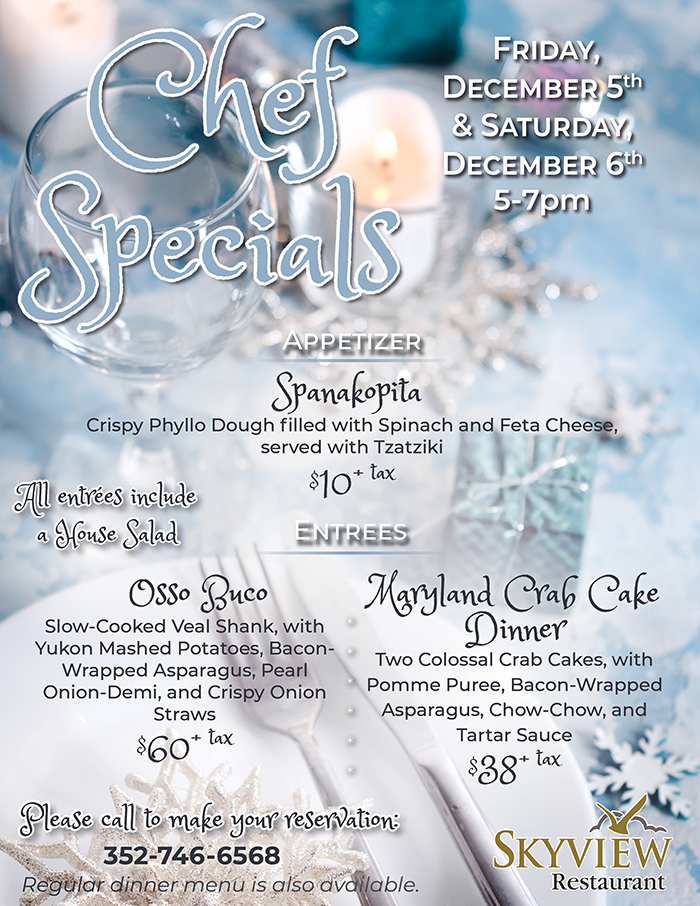 Home Events - Citrus Hills Skyview Chef Specials Skyview Chef Specials + Add to Google Calendar + iCal / Outlook export Date December 6 Time 5:00 pm - 7:00 pm Location Skyview Restaurant 2100 N Terra Vista Blvd, Hernando, FL 34442 Category RestaurantsSkyview Share this event