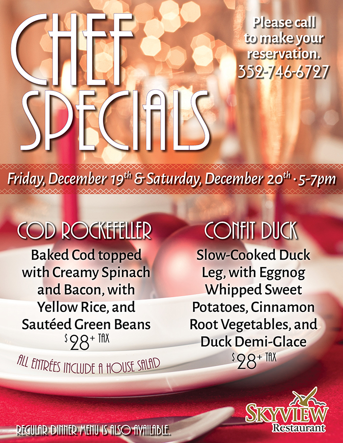 Home Events - Citrus Hills Skyview Chef Specials Skyview Chef Specials + Add to Google Calendar + iCal / Outlook export Date December 20 Time 5:00 pm - 7:00 pm Location Skyview Restaurant 2100 N Terra Vista Blvd, Hernando, FL 34442 Category RestaurantsSkyview Share this event