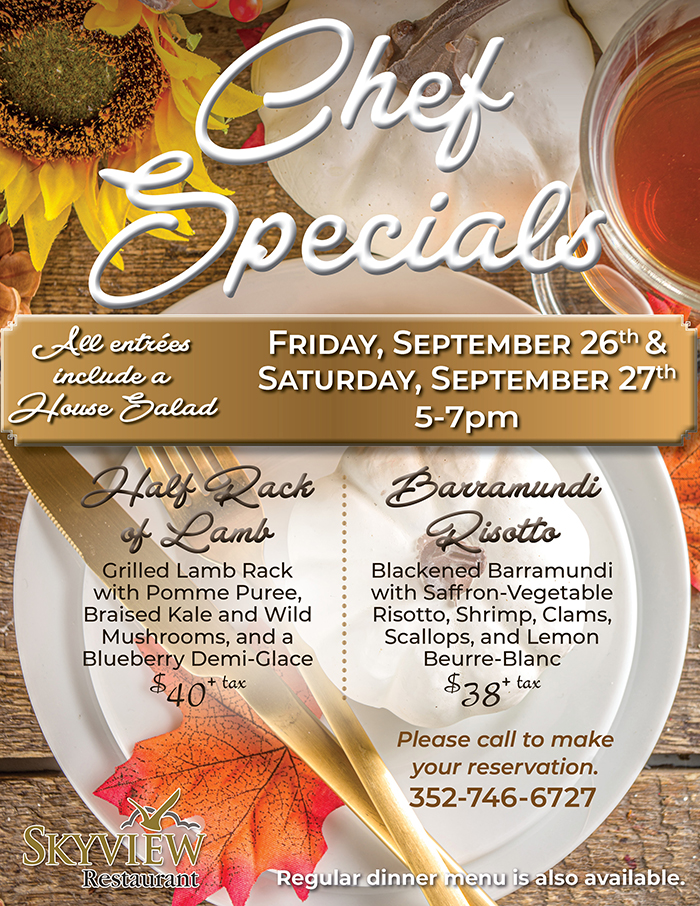 Home Events - Citrus Hills Skyview Chef Specials Skyview Chef Specials + Add to Google Calendar + iCal / Outlook export Date September 27 Expired! Time 5:00 pm - 7:00 pm Location Skyview Restaurant 2100 N Terra Vista Blvd, Hernando, FL 34442 Category RestaurantsSkyview Share this event