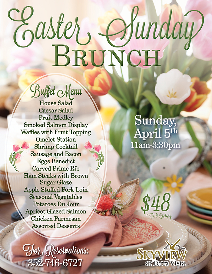 Home Events - Citrus Hills Skyview Easter Sunday Brunch Skyview Easter Sunday Brunch + Add to Google Calendar + iCal / Outlook export Date April 5 Time 11:00 am - 3:30 pm Location Skyview Restaurant 2100 N Terra Vista Blvd, Hernando, FL 34442 Category RestaurantsSkyview Share this event