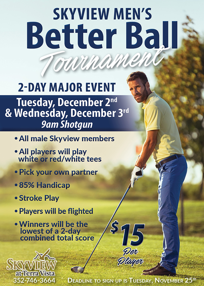 Home Events - Citrus Hills Skyview Men’s Better Ball Tournament 2-Day Major Event Skyview Men’s Better Ball Tournament 2-Day Major Event + Add to Google Calendar + iCal / Outlook export Date December 3 Time 9:00 am - 11:00 pm Location Skyview at Terra Vista 2100 N. Terra Vista Boulevard, Citrus Hills, FL Category Golf Share this event