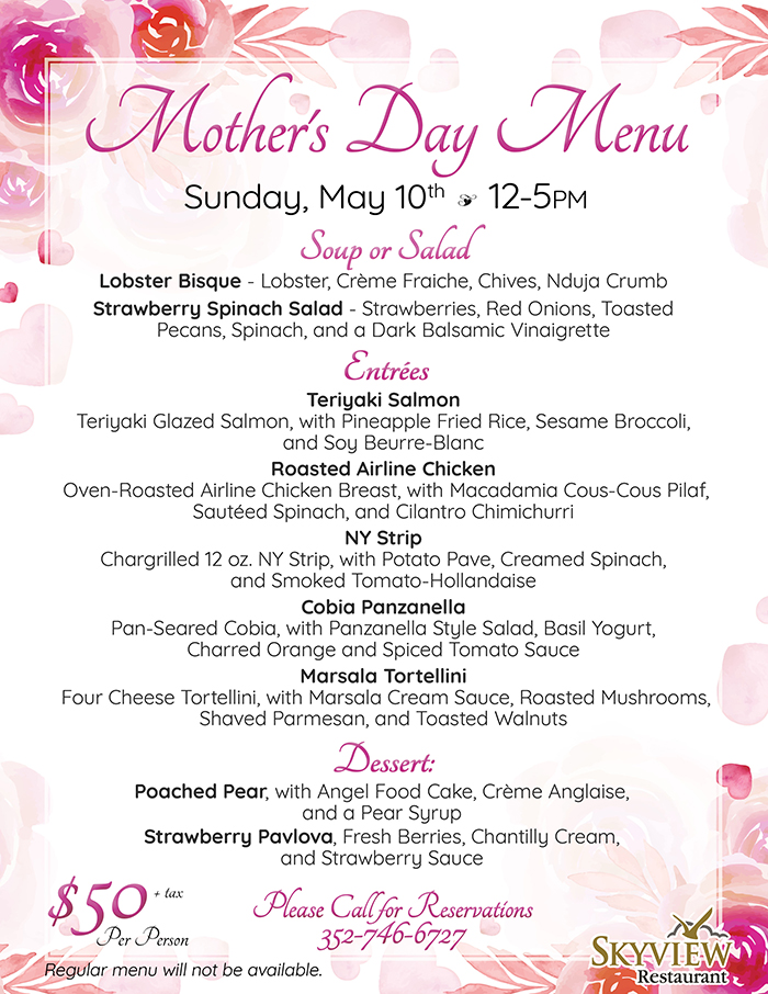 Home Events - Citrus Hills Skyview Mother’s Day Menu Skyview Mother’s Day Menu + Add to Google Calendar + iCal / Outlook export Date May 10 Time 12:00 pm - 5:00 pm Location Skyview Restaurant 2100 N Terra Vista Blvd, Hernando, FL 34442 Category RestaurantsSkyview Share this event