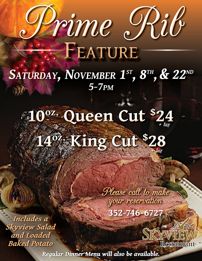 Home Events - Citrus Hills Skyview Prime Rib Feature Skyview Prime Rib Feature + Add to Google Calendar + iCal / Outlook export Date November 1 Time 5:00 pm - 7:00 pm Location Skyview Restaurant 2100 N Terra Vista Blvd, Hernando, FL 34442 Category RestaurantsSkyview Share this event