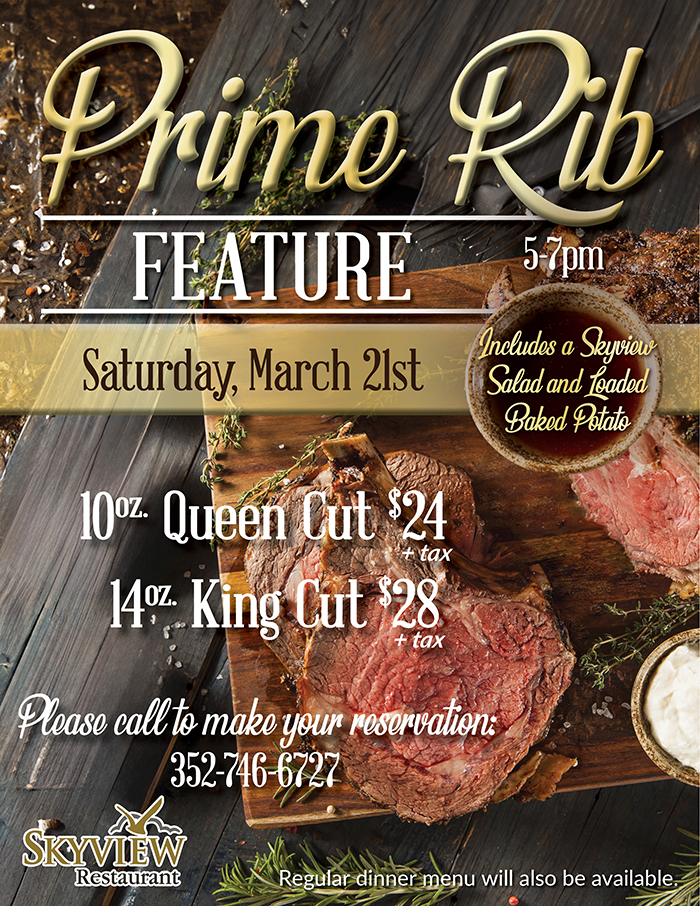 Home Events - Citrus Hills Skyview Prime Rib Feature Skyview Prime Rib Feature + Add to Google Calendar + iCal / Outlook export Date March 21 Time 5:00 pm - 7:00 pm Location Skyview Restaurant 2100 N Terra Vista Blvd, Hernando, FL 34442 Category RestaurantsSkyview Share this event
