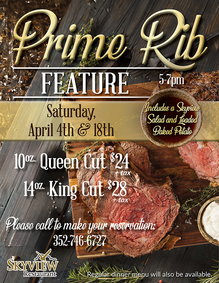Home Events - Citrus Hills Skyview Prime Rib Feature Skyview Prime Rib Feature + Add to Google Calendar + iCal / Outlook export Date April 4 Time 5:00 pm - 7:00 pm Location Skyview Restaurant 2100 N Terra Vista Blvd, Hernando, FL 34442 Category RestaurantsSkyview Share this event